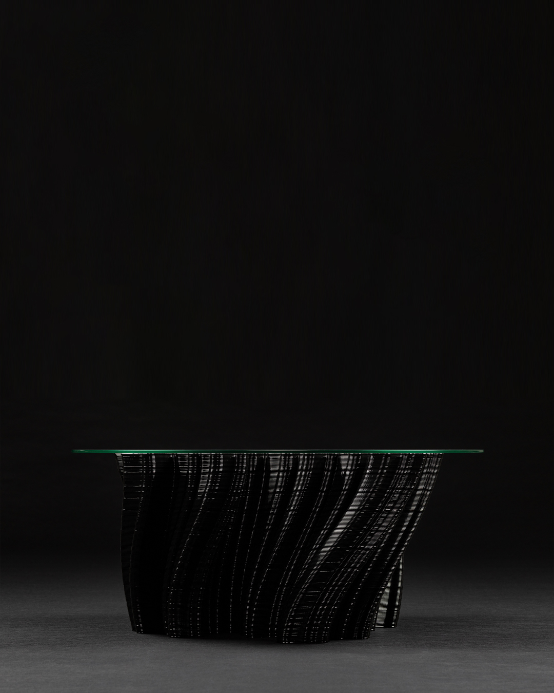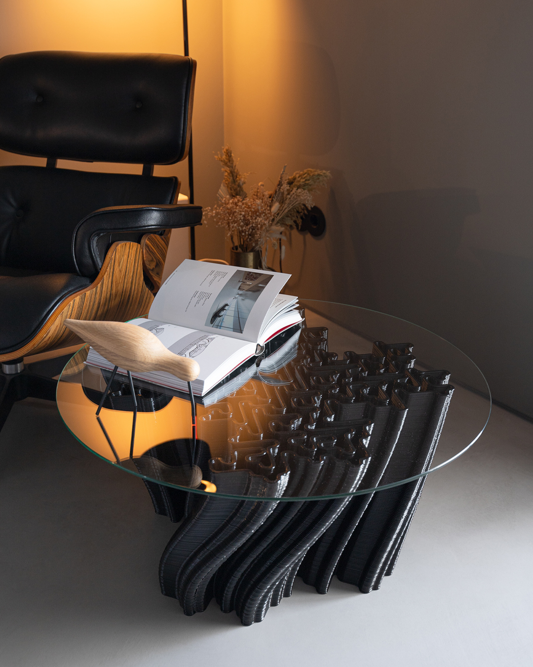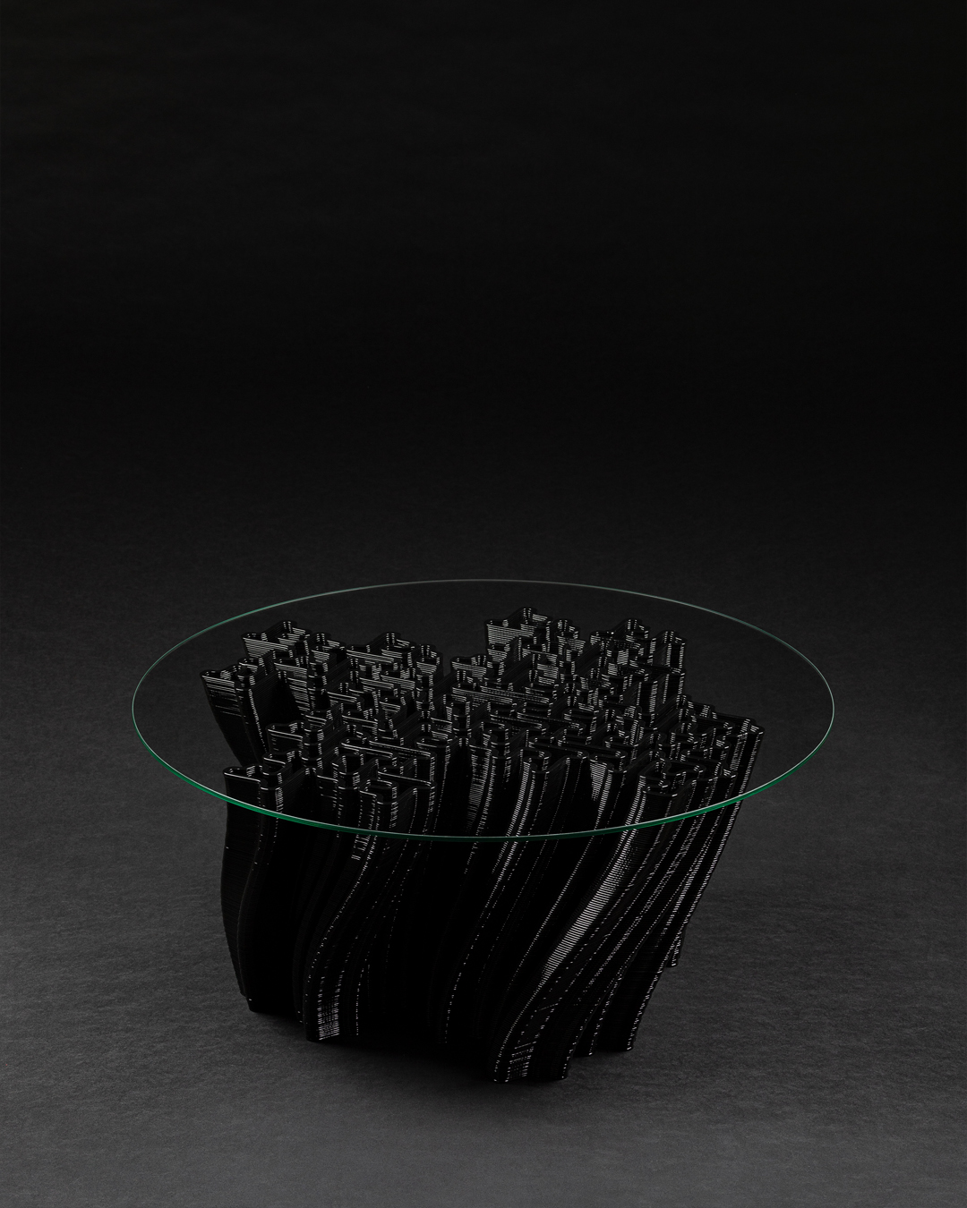 In mathematical analysis, space-filling curves are defined by intricate geometric patterns and recursive algorithms that traverse and occupy higher-dimensional spaces, ensuring complete coverage of a defined region. The fractal geometry that shapes these curves, simultaneously aesthetic and structural, illustrates how generative algorithms can be used, respecting their rules while enhancing their creative potential. A line that fills space automatically generates an organic, infinite path, guiding the extruder of a robotic arm toward a formal conception that merges form with function. The lines serve as inputs, but the outputs emerge as surfaces - crystalline, organic, or high-tech. The selected recycled material ( Rpetg) follows the formal matrix, exploring its unique substance and giving distinctive physical presence to the design piece. This work, created with 3D-printed robotic arms, employs Gary’s Space-Filling Curves algorithm to generate a looping fractal: an evolving spiral that defines the structure of the table. The creative process maps production paths through a direct human–machine, software-hardware interface. The resulting design evokes a futuristic, high-tech aesthetic, with a glass tabletop ensuring usability while completing the circular flow at the core of the structure. Despite its reliance on algorithmic and biomimetic principles to achieve visual impact, the coffee table does not compromise functionality. It delivers a seamless user experience while contributing decisively to the aesthetic refinement of contemporary environments. By transforming recursive code into matter, the design becomes a manifesto of how machines and creativity can co-author the future of form.
