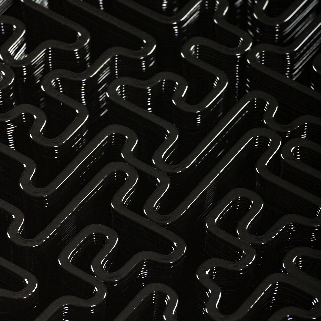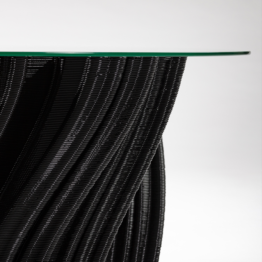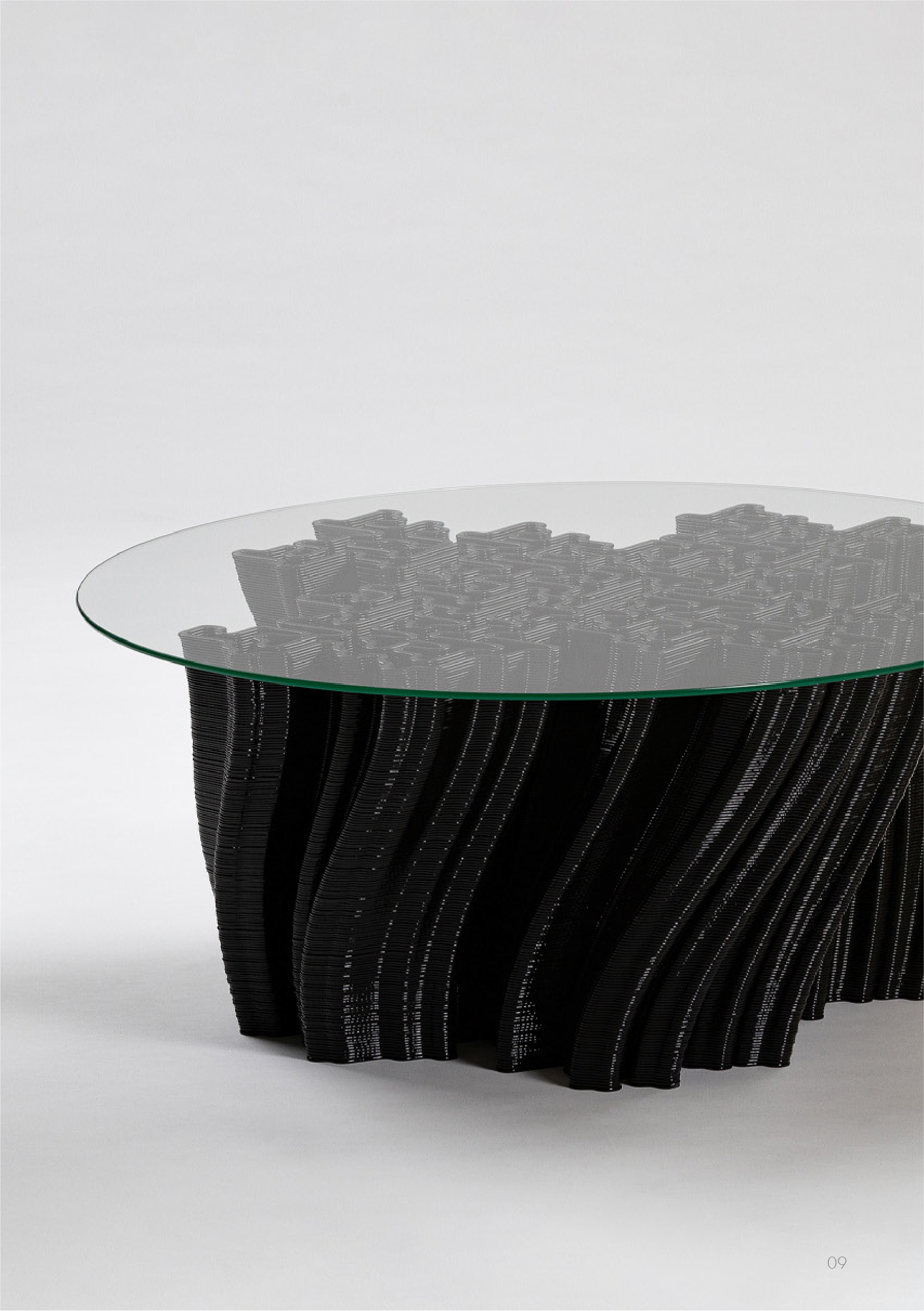 In mathematical analysis, space-filling curves are defined by intricate geometric patterns and recursive algorithms that traverse and occupy higher-dimensional spaces, ensuring complete coverage of a defined region. The fractal geometry that shapes these curves, simultaneously aesthetic and structural, illustrates how generative algorithms can be used, respecting their rules while enhancing their creative potential. A line that fills space automatically generates an organic, infinite path, guiding the extruder of a robotic arm toward a formal conception that merges form with function. The lines serve as inputs, but the outputs emerge as surfaces - crystalline, organic, or high-tech. The selected recycled material ( Rpetg) follows the formal matrix, exploring its unique substance and giving distinctive physical presence to the design piece. This work, created with 3D-printed robotic arms, employs Gary’s Space-Filling Curves algorithm to generate a looping fractal: an evolving spiral that defines the structure of the table. The creative process maps production paths through a direct human–machine, software-hardware interface. The resulting design evokes a futuristic, high-tech aesthetic, with a glass tabletop ensuring usability while completing the circular flow at the core of the structure. Despite its reliance on algorithmic and biomimetic principles to achieve visual impact, the coffee table does not compromise functionality. It delivers a seamless user experience while contributing decisively to the aesthetic refinement of contemporary environments. By transforming recursive code into matter, the design becomes a manifesto of how machines and creativity can co-author the future of form.