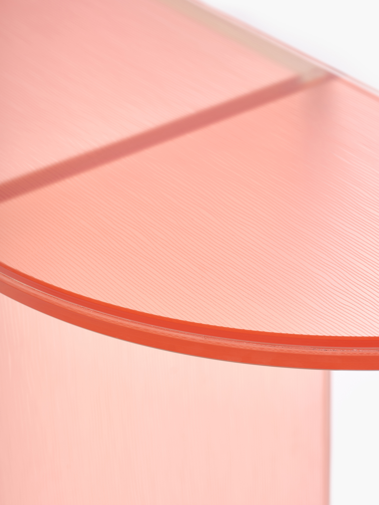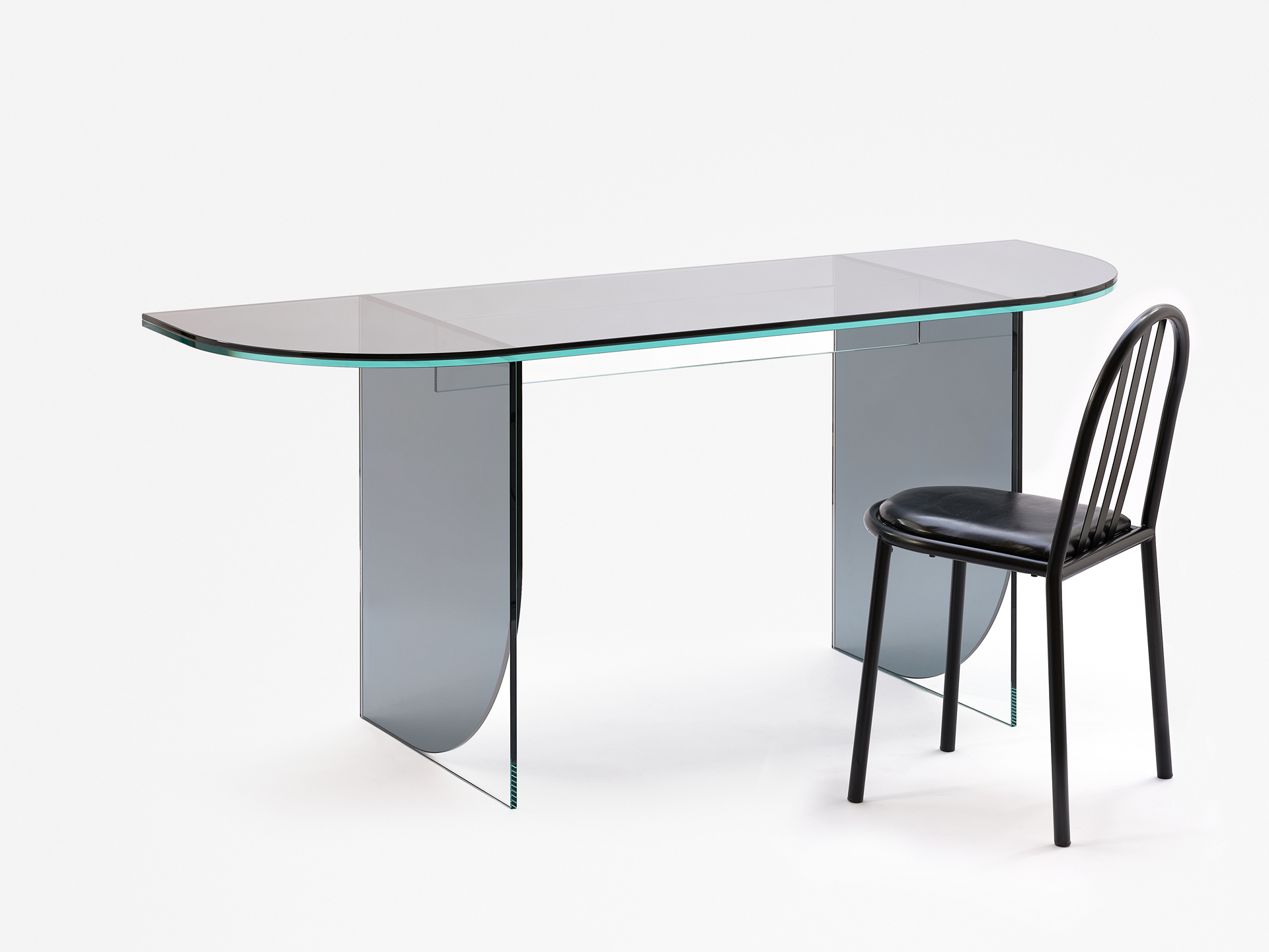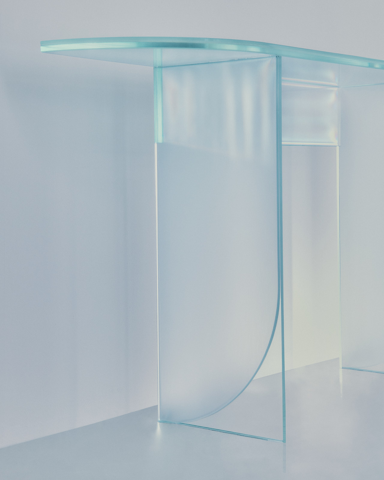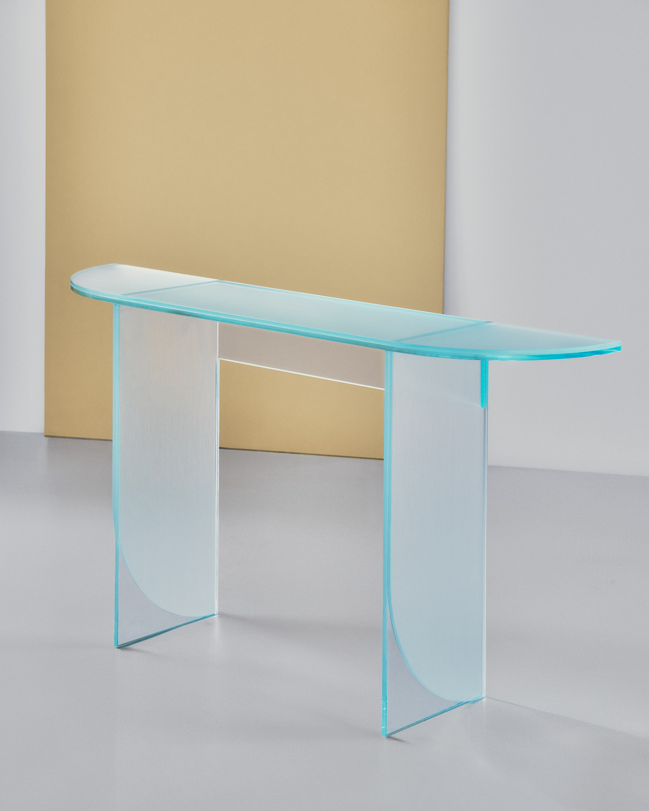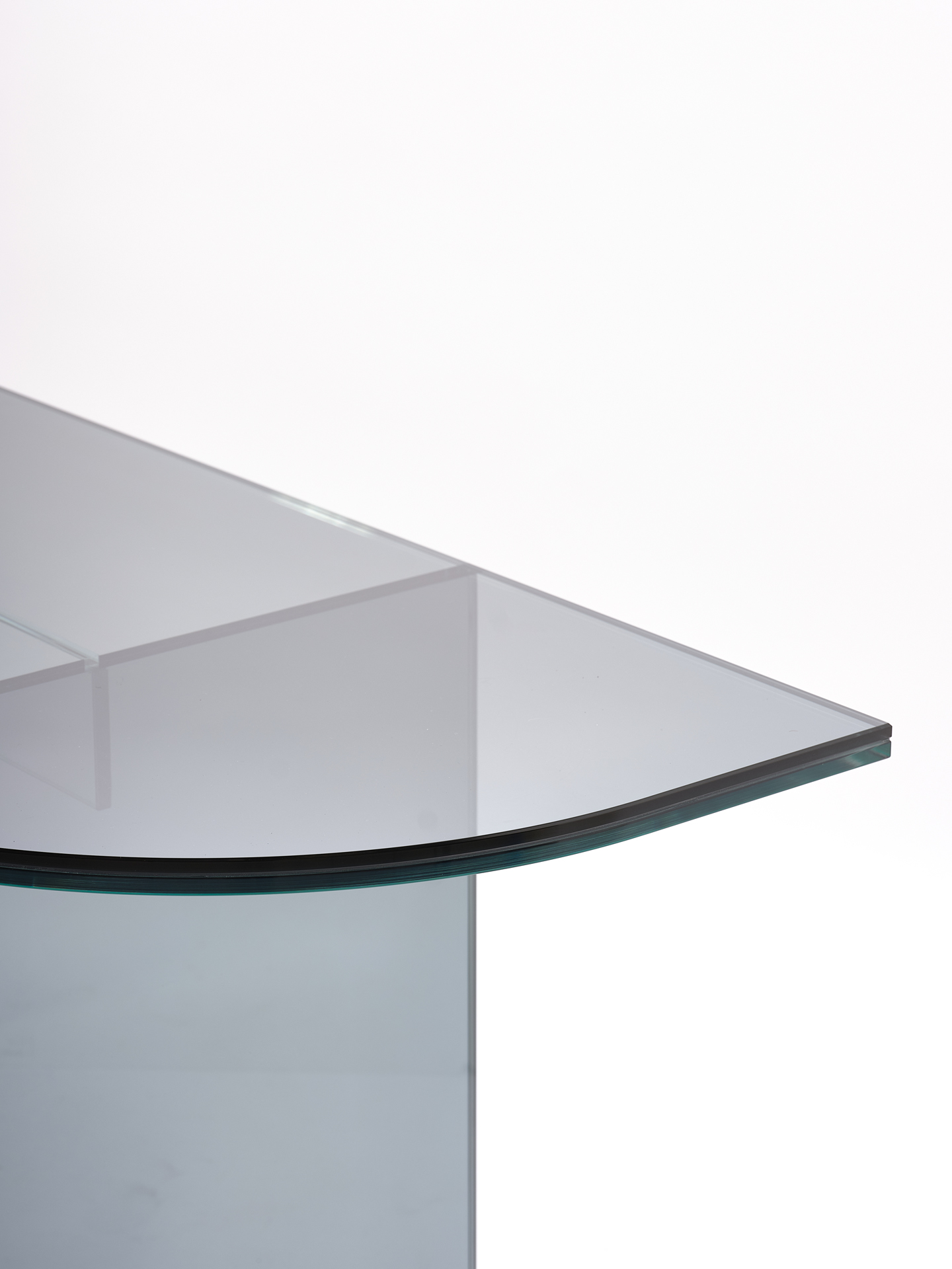 The ILLUSION collection by the Belgian designer Alain Gilles is defined by simple, essential geometric lines: a combination of rectangles and curves with a “trompe l’œil” effect. The graphic interplay is reminiscent of the minimalist designs of the Bauhaus movement of the 1920s. Exceptional pieces assembled by UV bonding, the consoles in frosted, textured or colored glass are the results of the unique craftsmanship of Glass Variations’ master glaziers and the talent of Alain Gilles. • The consoles are available in standard or specific dimensions: o S (140 x 30 cm), M (160 x 35 cm), L (160 x 40 cm), H 75 cm o Wall-desk (180 x 60 cm x 75 cm) • Customized colors: o Coral o Yellow o Bottle green o Smokey grey o Bronze o Specific bespoke colors on demand Details: Laminated textured glass, 18 to 22 mm thick: the top layer in a satin finish textured glass is laminated with an extra-clear glass and a coloured film. The console is hand assembled by UV bonding. Manufactured in France on demand Production lead time: 6 weeks